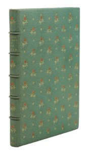 Paris, Mercure de France, 1895 ; in-12, maroquin céladon semé de fleurette dorées et mosaïquées de rouge, dos à nerfs orné des mêmes fleurs, cadre intérieur avec filets dorés et fleurs rouges aux angles, doublures et gardes de moire rose, tranches dorées sur témoins, chemise et étui, couverture (P. L. Martin).Édition originale. La carrière du poète décolle : il a 27 ans et il est publié au Mercure de France.