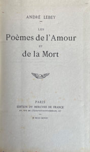 Les Colonnes du Temple. Paris, Mercure de France, 1900 ; in-12 réimposé in-8, demi-maroquin brun à coins, dos à nerfs, tête dorée, couverture. Édition originale. « Le temple sur les colonnes duquel M. André Lebey inscrit ses délicats poèmes est sans doute celui de la Vie intérieure » (in Iris, mai 1900). Un des 6 sur Hollande (n° 4) seul grand papier.