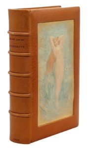 Paris, Mercure de France, 1896 ; in-18, maroquin fauve, composition en relief et en couleurs sur le plat supérieur signée LR (peinture sur veau modelé), dos à nerfs, cadre intérieur de même maroquin orné de filets dorés et fleurons, doublures et gardes de soie brochée, tranches dorées sur témoins, étui (E. Carayon).Édition originale du recueil considéré comme le chef d’œuvre de Pierre Louÿs, combinaison parfaite de style, d’émotion et d’hellénisme.