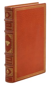 Paris, librairie des Annales, 1911; in-12, maroquin corail, filets dorés en encadrement sur les plats, dos à nerfs orné d’éventails et de fleurons dorés, roulette intérieure, tranches dorées sur témoins, couverture illustrée en couleurs, étui (Vermorel).Édition originale de cette pièce adaptée du roman de Pierre Louÿs.