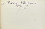 Envoi autographe à Pierre Frondaie. Le volume est enrichi d’une longue lettre de Louÿs à Frondaie (7 pp. in-8) 10 décembre 1909, au sujet d’une pièce qu’ils doivent écrire ensemble (La Femme et le Pantin ?).