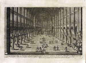 Important recueil de planches gravées par Aveline, qui forment une collection de vues de monuments de Paris et de châteaux aux alentours. Ces compositions vivantes agrémentées de nombreux personnages représentent principalement les parcs et jardins et Versailles, Marly, Fontainebleau, Saint-Germain-en-Laye, Saint-Cloud, Meudon, Chantilly, Vincennes. Le recueil est précédé d’un feuillet de table manuscrit, portant en titre Vües et perspectives gravées par Aveline en 1687, suivi de la mention Achetées à Paris en octobre 1725. Reliées à Aix en décembre 1765. Un feuillet supplémentaire a été ajouté postérieurement en début de volume, présente 5 petites gravures dont 4 cartes anciennes et au verso une vue de l’hôtel de ville de Paris. Reliure usée, restaurations ; titre frappé postérieurement ; planches brunies avec accidents et restaurations.