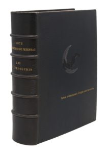 [Paris, G. Richard, 1892] ; très fort vol. petit in-4, maroquin bleu nuit, sur le plat supérieur chauve-souris en relief en noir volant devant une lune argentée, dos à nerfs, cadre intérieure de même maroquin avec chauves-souris à froid et filet doré, doublures de soie jaune à motifs de chauves-souris, gardes de soie argentée avec mêmes motifs, tête dorée (Marius Michel).Édition originale du premier livre de l’auteur, préfacé par Leconte de Lisle.