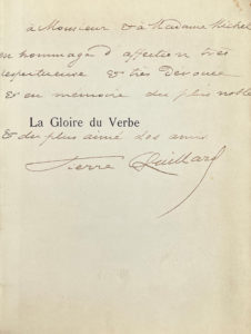 Envoi autographe à « Monsieur et à Madame Michel, en hommage d’affection très respectueuse et très dévouée et en mémoire du plus noble et du plus aimé des amis. »