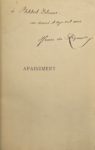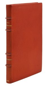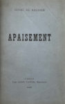 Paris, Léon Vanier, 1886 ; in-12, maroquin janséniste corail, dos à nerfs, roulette intérieure dorée, tranches dorées sur témoins, couverture, étui (Semet & Plumelle).Édition originale de toute rareté du second recueil de l’auteur. Elle fut imprimée à compte d’auteur sur les presses de Léon Épinette, alias Léo Trézenik, directeur de Lutèce qui avait accueilli les premiers vers de Régnier. « En 1886, lorsque je publiai mon petit volume de vers intitulé Apaisement, j’allai le déposer chez le concierge du 14 rue de Berri. C’était là qu’habitait alors J. M. de Heredia. Dans ce temps-là, j’avais pour éditeur Léon Vanier qui prenait en dépôt nos plaquettes que nous faisions imprimer où nous voulions, à nos frais et qu’il se chargeait ensuite de vendre, revêtues de sa marque, à de rares acheteurs. Il ne s’occupait pas du service. Je me vois encore, les poches bourrées d’exemplaires dûment dédicacés, et allant les remettre de porte en porte. Je ne connaissais personne, et je ne montais que chez Sully Prudhomme et chez Mallarmé. » Henri de Régnier, Les journaux de la vie littéraire : Actes du colloque de Brest, 18-19 octobre 2007, Presses universitaires de Rennes, 2009, p. 77.