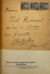 Long envoi autographe à Henri de Régnier couvrant deux feuillets blancs préliminaires : « à M. Henri de Régnier, qui dédaignant le sens acquis et séculaire des vocables, sut balbutier avec la grâce virginale et la mélancolie de Lys ou d’Aurores qui hésitent à surgir dans leur blancheur, ce que les ignorants appellent l’Ineffable. » La dédicace se poursuit…