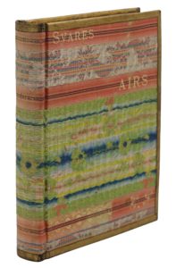 Paris, Mercure de France, 1900 ; in-12 carré, reliure à la bradel de soie brochée formant des motifs multicolores dans des tons pastels de rose, de vert, de bleu et d’argent, bordures des plats protégées par un papier doré, auteur, titre et initiales CP dorés sur le plat supérieur, couverture conservée, chemise et étui recouverts de la même soie et du même papier doré. Édition originale du premier recueil de vers de Suarès, très rare.