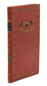 Paris, A. Lemerre, 1869 ; in-12 de [2] ff., 54 pp., [1] f., maroquin rose, perles de maroquin noir mosaïquées en encadrement sur les plats, masques de comédie noirs sur le plat supérieur, dos lisse orné d’un fleuron mosaïqué de noir, pièce noire, cadre intérieur du même décor de perles noires, tête dorée, couverture. Édition originale, encore publiée aux dépens de l’auteur. Rimbaud trouvait ce recueil « adorable », Mallarmé y voyait « un éternel bijou ».