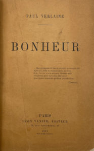 Bonheur. Paris, Léon Vanier, 1891 ; in-12 de 2 f. bl., [2] ff., 120 pp., demi-maroquin noisette à coins, dos à nerfs, tête dorée, couverture saumon. Édition originale. Le recueil censé traduire des élans chrétiens exprime plutôt une nostalgie religieuse. Exemplaire sur vélin couché, papier d’édition après 55 Hollande. Van Bever & Monda, pp. 45-47. – Galantaris, n° 153.