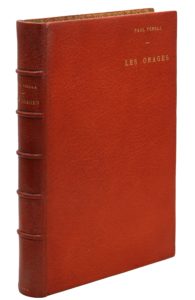 Paris, Comptoir d’édition, 1889 ; in-8, maroquin orangé, dos à nerfs, auteur et titre dorés sur le plat supérieur, dos à nerfs, tête dorée, couverture illustrée, étui. Édition originale ornée de 12 compositions hors texte de Joseph Villeclère.