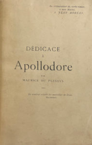 Dédicace à Apollodore. Paris, Léon Vanier, 1891 ; plaquette in-16 de 11 pp., 2 ff., demi-maroquin à gros grain rouge, à coins, dos lisse, tête dorée, couverture (Canape). Édition originale du premier recueil de Maurice Du Plessys, disciple de l’École Romane, dédié « au restaurateur du verbe roman, à mon maître, Jean Moréas ».