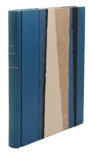 Anvers, Buschmann, 1924 ; petit in-4 carré, bradel demi-box bleu outremer à bandes, les plats ornés de bandes de papier japon de différentes couleurs déchirées irrégulièrement, couverture ornementée (Christine Léonard).Édition originale décorée de 42 culs-de-lampe gravés sur bois par Max Elskamp, « noirs de la mémoire et de la mort ». C’est le dernier recueil publié du vivant de l’auteur.