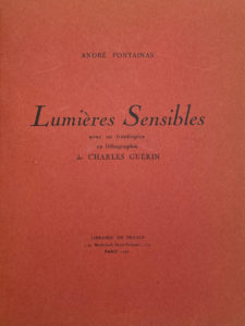 Lumières sensibles, poèmes. Paris, Librairie de France, 1926 ; in-8, demi-veau blond, dos à nerfs, fleurons dorés, pièces verte et rouge, couverture corail imprimée (Le Douarin). Édition originale ornée d’un frontispice lithographié de Charles Guérin (graveur homonyme du poète Charles Guérin). Il ne semble pas avoir été tiré de grand papier. Envoi à l’éditeur poète Auguste-Pierre Garnier. Poème manuscrit « Paysage breton » relié en tête et 2 lettres autographes du même au même, volantes. Talvart et Place, VI, p. 91, n°23.