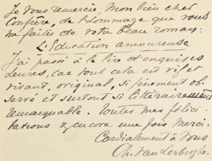 Joint : billet de félicitation signé à Paul André pour L’Éducation amoureuse et lettre autographe volante (4 pp. in-12) à Vallette autour de la préface à demander à Anatole France.