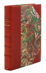 Paris, Charpentier, 1895 ; in-12, demi-maroquin rouge à coins, dos à nerfs, tête dorée, couverture (Patrice Goy).Édition originale. « C’est l’inspiration du présent livre qui étonne. (…) Par la volonté des dieux propices, il échappa à la contagion d’idées très précieuses par elles-mêmes mais que l’indécente familiarité des sots avait avilie, comme toujours…. De là ce livre où l’on ne retrouve pas l’air de famille ordinaire aux livres de début qui s’impriment en France et en Belgique » (Pierre Quillard, Mercure de France, 1895).