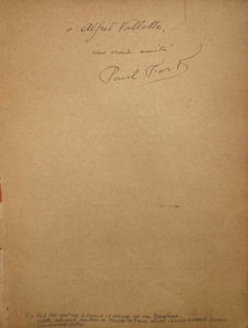 Envoi à Alfred Vallette, dont Paul Fort fut proche toute sa vie et chez qui (il était directeur du Mercure de France) il publiera de nombreux livres. Son neveu épousera la fille d’Alfred Vallette. L’auteur n’a pas encore maniéré son écriture ni fixé sa signature.
