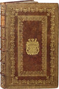 [FÊTES]. Recueil factice réunissant 3 livres de fêtes. Paris, 1674-1679. In folio, veau fauve moucheté, dos orné, plats richement ornés d’encadrements multiple de larges roulettes dorées et petits fers, armoiries dorées au centre, tranches...