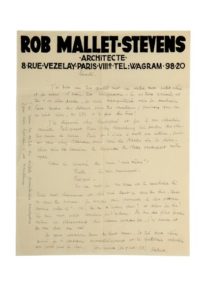 MALLET-STEVENS Robert. (1886-1945). L.A.S. «Robert», lundi [1926 ?], à «mon petit chéri» ; 1 page in-4 à son en-tête Rob. Mallet-Stevens. Architecte... Lettre d'amour. Il s'inquiète de la santé de son «petit chéri», et donne son emploi du temps : «J'ai déjeuné chez Rossignol et fus à son chantier ensuite. Fatiguant. Puis chez Rosemberg lui porter des photos pour sa revue. [...] je pars chez Chareau, puis rue de Naples où je dine. [...] Voici le résumé de mon “moi-même” : Triste - tu sais pourquoi. Fatigué. En un mot je me rase et te voudrais là. [...] Tu sais mon petit combien je t'adore. [...] mon chéri aimé je t'embrasse particulièrement et te gratterais volontiers un petit peu le dos»...