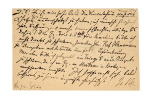 BRAHMS Johannes. (1833-1897). L.A.S. «J. Br.», [Vienne 1er mars 1892], à son éditeur Fritz SIMROCK à Berlin ; 1 page oblong in-12, adresse au dos (Correspondenz-Karte). Au sujet de l'envoi à Joseph JOACHIM les partitions du Quintette et du Trio avec clarinette. «Es ist mir sehr leid, die Krankheit unseres Chefs unterschätzt zu haben ; ich wünsche herzlichst gute Besserung - und mache keine schlechten Witze bis dahin ! Die Exemplare Trio und Quintett für Joachim bitte ich nicht direkt zu schicken sondern Hrn. Rob. Hausmann zu übergeben, mit der Bitte um freundliche Beförderung. Mir aber bitte ich gelegentlich ein Trio op. 8 neue Ausgabe zu schicken, da ich mein Exemplar an Martucci in Bologna ver­schenken mußte. Ich hoffe recht sehr, bald Besseres zu hören, und grüße herzlichst !»... Il est désolé d'avoir sous-estimé la maladie du patron et lui souhaite un prompt rétablissement - sans mauvaises blagues d'ici là ! Il demande de ne pas envoyer directement les copies du Trio et du Quintette pour Joachim mais de les adresser à Rob. Hausmann qui les lui remettra. Il prie de lui envoyer un nouvel exemplaire du Trio op 8, car il a donné son exemplaire à Giuseppe MARTUCCI à Bologne... Briefwechsel (Kalbeck) XII, n° 754 (Simrock III p. 61).