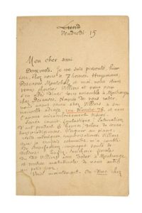 BLOY Léon. (1846-1917). L.A.S. «Léon Bloy», Vendredi 15 [juillet 1887], à son «cher ami» [probablement Robert du Pontavice de Heussey, cousin de Villiers de L'Isle-Adam] ; 2 pages in-8 (petite mouillure au bas du feuillet). Belle lettre au sujet d'une soirée avec Villiers de L'Isle-Adam. Il est venu «hier soir, chez vous à 7 heures. Huysmans, Descaves, Montchal et moi, nous étions venus chercher Villiers et vous pour s'en aller dîner tous ensemble à Montrouge, chez Descaves [le père de l'écrivain Lucien Descaves]. Navrés de vous rater, nous avons couru chez Villiers à sa nouvelle adresse, rue Blanche 76, et nous l'avons miraculeusement trouvé. Soirée inouïe, fantastique ! Saturation d'art pendant 6 heures, délire de sensations prodi­gieuses. Wagner au piano, récits, mimiques, improvisations. Villiers que je croyais connaître, m'a comblé de stupéfaction, imprégné, soulé de délices. Enfin, coucherie finale du dit Villiers avec Totor [le fils de Villiers de L'Isle-Adam] à Montrouge et rentrée matinale de nous autres au petit jour. [...] On dîne chez moi, demain soir samedi à 7 heures. Invités : Huysmans, Villiers, Descaves, Villiers, Landry et vous, cher ami. [...] Que sera ce festin ? Je l'ignore. Ce sera très drôle évidemment. Villiers nous a tous affolés»... Il ajoute en post-scriptum : «Mon nègre blond tient à vous être présenté», [allusion à son roman Le Désespéré, dans lequel il a décrit Louis Montchal sous les traits de Georges Leverdier, «nègre blond»].