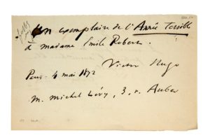 HUGO Victor. (1802-1885). P.A.S. «Victor Hugo», Paris 4 mais 1872 ; 1 page oblong in-8. Billet …