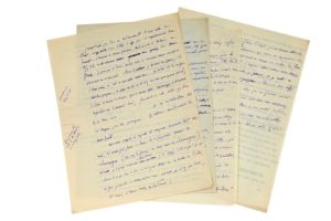 MONTHERLANT Henry de. (189-1972). MANUSCRIT autographe, [1937] ; 4 pages in4, au dos de dactylographies et d'une lettre (7 juillet 1937). Réponse à Georges POUPET, critique au journal Le Jour, sur Le Démon du Bien (troisième roman du cycle Les Jeunes Filles). Poupet regrette «que j'aie abandonné les livres, tels que Service inutile, où je m'exprimais en mon nom personnel, pour des romans où je laisse parler des personnages». Montherlant explique ce «glissement» : «C'est que je ne mets guère le nez en dehors de ma coquille, dans la société française d'aujourd'hui, sans être frappé de dégoût, que je ne pourrais faire rien d'autre qu'exprimer, si je m'exprimais en mon nom propre. Or, on ne fait pas une oeuvre uniquement avec de l'indignation et du dégoût»... De par son éducation, il est resté très strict sur certaines choses, et il raconte ainsi une anecdote récemment arrivée dans un restaurant et qui l'a indigné... Il revient pour finir à l'accent de Service inutile : «La France est un étang compact de lâcheté. Rien n'éclate, à cause de la lâcheté. [...] ce roman sur les milieux coloniaux, que vous me reprochez de ne pas publier, il serait tout le temps de ce ton-là. Encore une fois j'ai été élevé à respecter certains ordres, certaines classes : quand je ne peux plus les respecter, je frémis, et je mets ce frémissement sur le papier»..