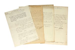 MARÉCHAUX. 3 L.S. de maréchaux d'Empire. DAVOUT, prince d'Eckmulh : Hambourg 24 janvier 1812, au général Lefèbvre. SOULT, duc de Dalmatie : 21 août 1842, au ministre de l'agriculture et du commerce. VICTOR, duc de Bellune : 10 mai 1822, à M. Tresvaux de Berteux, On joint la copie d'un arrêté du maréchal SUCHET, duc d'Albufera, à son en-tête, Q.G. de Valence 30 juillet 1812, signée par l'intendant gnral d'Aragon le baron Lacuée.