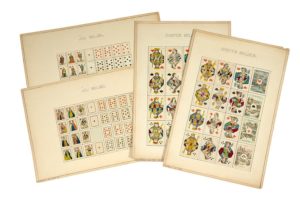 ENSEMBLE DE CARTES À JOUER. - Jeu Belge de Daveluy à Bruges, presque complet, 31 cartes sur 32, 7 de Trèfle manquant (fin XIXe siècle). Estimation - Jeu Belge de Léonard Biermans, 16 cartes (fin XIXe siècle), illustrations de villes portugaises sur les As. Estimation - Jeu Belge de Léonard Biermans, 16 cartes (fin XIXe siècle), illustrations de villes allemandes sur les As sauf As de coeur. - Jeu Belge non identifié, complet, 32 cartes de format réduit (fin XIXe siècle).