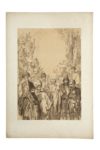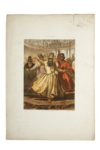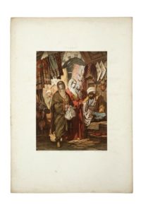 PREZIOSI (Amadeo). Stamboul. Moeurs et costumes. Paris, Canson [Impr. Lemercier], 1883. In-plano, [4] f. (faux-titre, titre, introd., table), 28 pl. lith., en feuilles sous portefeuille ancien à lacets (port. très usé ; rousseurs, traces de poussière ; accrocs et accidents en marge). Important recueil offrant 28 compositions dessinées et lithogra­phiées en couleurs par Amadeo Preziosi. Les planches (env. 35 x 26 cm.) tirées sur papier sont montées sur un papier plus fort (63 x 45 cm.), sur lequel sont imprimés les titre, numéros et les adresses de libraire et imprimeur. Peintre orientaliste originaire de Malte, formé à l'Ecole des Beaux- Arts de Paris, le comte Amadeo Preziosi (1816-1882) est arrivé à Istambul à la fin de 1842 et y demeura jusqu'à sa mort en 1882. Il se rendit célèbre comme le peintre reflétant la vie contemporaine à Istambul, et fut notamment employé comme peintre du palais pendant la période d'Abdülhamit II. C'est un Orient romantique et idéal qu'il illustre. Ses compositions sont propres à séduire les riches touristes occidentaux, mais également les amateurs turcs, qui constituent sa clientèle. Scènes de marchés, artisans typiques, personnages variés en costume traditionnel, scènes de danse envoûtantes, vues de paysages ou de quartiers anciens, toute son oeuvre concourt à fixer l'image rêvée de l'Orient, en particulier de la Turquie. Ce recueil est publié dans la collection «Encyclopédie des Arts décoratifs de l'Orient». Tiré à 500 exemplaires, celui-ci n° 208. Il est joint une planche lithographiée en bistre provenant d'un autre ouvrage.