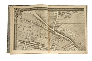 [PARIS]. [TURGOT], BRETEZ (Louis). Plan de Paris commencé l'année 1734, dessiné et gravé sous les ordres de Messire Michel Etienne Turgot... achevé de graver en 1739. Paris, s.d. In-folio, 21 planches doubles gravées sur cuivre, demi-basane modeste XIXe s., monté sur onglets (plats détachés et usés, sans couvrure au dos ; lég. brunissure au pli central de chaque pl. dû à la colle des onglets, petits trav. de vers au milieu des pl. 4, 5 et 14 ; petit trou sur une bordure pl.17). Le plus célèbre des plans de Paris, à juste titre, puisqu'il offre sans conteste la plus belle représentation de la ville sous l'Ancien Régime qu'il nous soit donné d'apprécier. Réalisation prestigieuse, elle fut imaginée par Michel Etienne Turgot, prévôt des marchands de Paris, qui en confia la réalisation à Louis Bretez, membre de l'Académie de peinture et de sculpture, et en suivit attentivement toutes les étapes de l'exécution. Destiné avant tout à promouvoir la grandeur de la ville de Paris et du royaume, le plan fut amplement diffusé dans les provinces de France, et dans les principales cours d'Europe. Le plan se compose de 20 planches et d'une planche supplé­mentaire offrant le tableau d'assemblage. Comme le plus souvent, dans cet exemplaire les planches 18 et 19 contenant le titre sont assemblées. Tirage comme toujours non daté, sur papier ancien vergé fort filigrané à l'aigle. (Boutier 219).