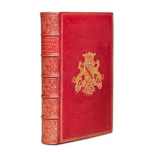 [RELIURE AUX ARMES]. VECELLIO (Cesare). Costumes anciens et modernes. Habiti antichi e moderni di tutto il mondo, di Cesare Vecellio, précédés d'un Essai sur la gravure sur bois par M. Amb. Firmin Didot. Paris, typo. de Firmin Didot frères, 1860. Deux tomes en un volume in-8, maroquin rouge, dos à nerfs orné, auteur, titre, lieu et date dorés, plats bordés d'un triple filet doré avec armes frappées au centre, double filet doré aux coupes, dentelle intérieure, tranches dorées [Allô], étui plexiglas, fines restaurations aux mors (traces de cire sur les plats, fente partielle à l'étui). Première édition contenant une traduction du texte en français, du très célèbre recueil de Vecellio initialement paru en 1590. Elle est illustrée de 513 figures de personnages en costumes nouvellement dessinés d'après l'édition de 1598. Bel exemplaire sur papier de Chine, parfaitement établi par Allô. PROVENANCE Marquis de Roualle (reliure aux armes).
