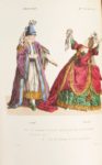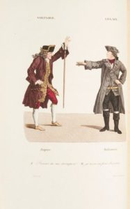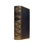 [ARNAULT (Antoine-Vincent)]. Les souvenirs et les regrets du vieil amateur dramatique, ou Lettres d'un oncle à son neveu sur l'ancien théâtre français... Paris, C. Froment, 1829. Fort in-12, VIII-214 p., [1] f. (placement des gravures), maroquin bleu nuit, dos à 5 nerfs, titre et date dorés, caissons richement ornés aux petits fers, triple filet doré encadrant les plats, double filet doré sur les coupes, coiffes guillochées, dentelle intérieure, tranches marbrées et dorées sur témoins [Belz] (frott. discret sur la coiffe et les coupes en pied ; rousseurs modérées sur certaines pages et une pl. ; 2 pl. mal placées). Édition originale, illustrée de jolies représentations de personnages en costume théâtral, gravées d'après les miniatures originales peintes d'après nature par Foëch de Basle et Whirsker : un fron­tispice et 39 planches, le tout gravé et colorié Exemplaire conforme à la table qui ne signale que le frontis­pice et 35 planches, et qui semble donc renfermer 4 planches supplémentaires. Imprimé sur papier vergé, il contient une suite en noir de presque toutes les gravures (sauf 4 d'entre elles). Ainsi, chaque gravure se trouve en deux état (en couleur et en noir) sauf celles face aux pages 57, 63, 69, 197 qui se trouvent seulement en couleurs. Bel exemplaire très bien relié par Belz, successeur de Niedrée. PROVENANCE Du Tillet, 19e s. (membre non identifié de cette famille comprenant plusieurs magistrats et bibliophiles, avec ex-libris armorié doré sur cuir, d'or à la croix pattée et alaisée de gueules).