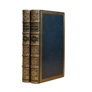 BAYARD. DAUDET (Alphonse). Fromont jeune et Risler ainé, moeurs parisiennes. Paris, L. Conquet, 1885. 2 volumes in-8, maroquin bleu foncé, dos à 5 nerfs saillants ornés de pointillés dorés, auteur, titre et tomaison dorés, lieu et date frappées en queue, caissons richement ornés, plats encadrés de 5 filets dorés, double filet doré sur les coiffes et coupes, dentelle intérieure, tranches dorées sur témoins, couverture et dos conservés [Champs] (dos très légèrement passés, infimes frottements aux coupes en pied.). Édition illustrée de 12 planches dont un frontispice, gravées à l'eau-forte par J. Massard d'après compositions d'Émile Bayard tirées chez Ch. Chadron aîné. Tirage limité à 500 exemplaires numérotés : un des 150 de tête sur grand papier japon impérial (n° 53), contenant un 2ème état, avant la lettre, de toutes les planches à l'exception du frontispice. Jolie reliure originale signée de Champs, parfaitement exécutée.