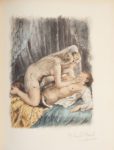 BÉCAT. RADIGUET (Raymond). Le Diable au corps. Paris, Georges Guillot, 1957. In-4, 182 p., demi-maroquin rouge, dos à 4 nerfs saillants, auteur et titre dorés, tête dorée, non rogné, couverture conservée. Édition précédée d'une préface inédite de Jean Cocteau et illustrée de 16 compositions en couleurs de Paul-Emile Bécat : 1 frontispice, et 15 à pleine page ; tirées par Louis Duval et coloriée à la main par Jean et Paulette Monnier. Tirage limité à 1000 exemplaires numérotés : l'un des 940 sur vélin de Rives à la forme (n° 847).