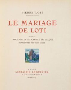 BECQUE. LOTI (Pierre). Le mariage de Loti. Paris, Lemercier, 1927. In-4, [3] f., 208 p., demi-chagrin noir postérieur, dos à 5 nerfs, titre et auteur dorés, tête dorée, non rogné, couverture conservée (taches en tête de la couverture). Édition illustrée de 30 compositions de Maurice de Becque, mises en couleurs par J. Saudé, dont 19 hors-texte et 1 frontispice. Tirage limité à 285 exemplaires numérotés : un des 18 hors com­merce, n° IX, sur papier vélin Lafuma, contenant l'état définitif des illustrations.