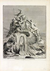 Important recueil réunissant 128 planches gravées sur cuivre, contenant : Divers desseins de décorations de pavillons inventez par Monsieur Le Brun Premier Peintre du Roy. [Paris], se vendent chez Edelinck, s.d. : titre gravé et 13 planches. Recueil de divers desseins de fontaines et de frises maritimes inventez et dessignez par Monsieur Le Brun. [Paris], Edelinck, s.d. : titre gravé et 39 planches, dont celles des frises marines gravées par Louis de Chastillon. Une suite de 31 planches montées sur les bosquets de Versailles publiées chez Langlois, dont 6 par Pérelle. Puis, notamment : 2 planches des groupes sculptés des jardins de Marly gravés par Thomassin d’après Coysevox. – 9 planches sur Marly, dont un plan et 2 vues des jardins publiés chez Langlois, une grande vue dépliante de la machine de Marly et 5 plans et élévations du château, dont 2 d’après Blondel. – 2 plans du domaine de Trianon parus chez Demortain, dont un gravé d’après Le Pautre. – 2 plans du domaine de Versailles dont un par Nicolas de Fer. – 12 planches sur le domaine de Clagny, dont un plan des jardins et 9 plans du château d’après Jules Hardouin Mansart et 2 vues des jardins par Pérelle. – 5 planches sur les écuries de Versailles, d’après Le Blond. – Une suite de 7 planches sur l’orangerie de Versailles. – 4 planches sur le Louvre d’après Blondel. Plats fortement épidermés, reliure soigneusement restaurée. Brûlures dans les marges latérales, rousseurs éparses et quelques réparations.
