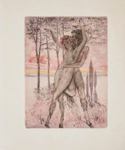 CHIMOT. LOUYS (Pierre). Les poésies de Méléagre. Paris, Devambez, 1926. In-4, en feuilles sous couverture rempliée, chemise et étui éditeur (coins de la chemise émoussés). Édition illustrée de 15 eaux-fortes originales en couleurs d'Édouard Chimot (1880-1959), dont 10 à pleine page. Tirage limité à 230 exemplaires : un des 135 sur papier vélin d'Arches (n° 197) contenant l'état définitif des illustrations. Enrichi d'une suite des planches en noir sur vélin d'Arches. PROVENANCE Maurice J. Lachard (ex-libris).