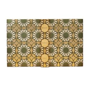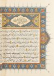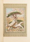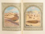 DINET. SLIMAN BEN IBRAHIM BAÂMER. El Fiafi oua el Kifar ou le Désert. Paris, Piazza, 1911. In-8, maroquin crème, dos lisse portant les noms d'auteur et d'illustrateur et le titre dorés, riche décor mosaïqué d'inspiration arabe en continu sur les plats et le dos, avec pièces en étoiles de maroquin bronze, pièces géométriques de maroquin sable rehaussées de f leurons dorés, doublures de daim ocre, gardes de daim anis, tranches dorées, couv. et dos conservés, chemise demi-maroquin vert à bandes, étui [Mercher] (dos très légèrement passé, légers frottements localisés aux mors, dos de la chemise insolé, petits frott. à l'étui). Splendide ouvrage illustré de nombreux ornements et cadres en couleurs et de 50 compositions en couleurs du peintre Étienne Dinet (1861-1929) dont 25 à pleine page. Tirage limité à 450 exemplaires : un des 15 de tête sur japon mince (n° 5), contenant une aquarelle originale signée de l'artiste, et deux suites sur japon mince des illustrations, l'une en noir et l'autre en couleurs. Enrichi d'un dessin oriental peint à l'or sur un feuillet de velin relié en début de volume. Splendide reliure originale signée d'Henri Mercher et datée de 1959. PROVENANCE MAURICE J. LACHARD (PAR DESCENDANCE).
