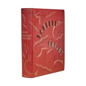 DUFY. MONFORT (E.) . La belle enfant ou l'amour à quarante ans. Paris, A. Vollard, 1930. In-4, maroquin rouge brique, dos lisse portant le nom de l'auteur doré, plats décorés de compositions dans le style de Dufy réalisées aux filets noir et or, avec au plat sup. le titre mosaïqué, contreplats bordés de maroquin rouge, doublures de maroquin brun, avec au centre une figure aux filets noir et or, gardes de satin brun, tête dorée, chemise demi-maroquin vert bronze à bandes, étui [Gruel] (dos de la chemise passé, légers frott. à l'étui). Ouvrage illustré de 94 eaux-fortes de Raoul Dufy, dont 16 hors-texte. Tirage limité à 390 exemplaires : un des 30 de tête sur japon ancien (n°4) contenant une suite de toutes les eaux-fortes sur vergé Monval. Paraphes autographes du peintre et de l'éditeur à la justification. PROVENANCE Maurice J. Lachard (par descendance). (Rauch, Les Peintres et le livre, n° 47).