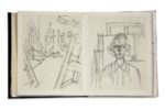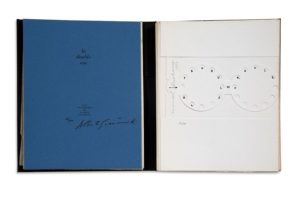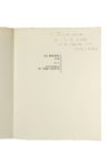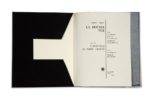 GIACOMETTI. DUCHAMP. LEBEL (Robert). La double vue. Avec un diptyque gravé à l'eau-forte par Alberto Giacometti ; suivi de : L'inventeur du temps gratuit. Avec un pliage de Marcel Duchamp. [Paris], Le Soleil Noir, 1964. In-4, en feuilles sous couverture rempliée, portant sur la première page de couv. un titre sur fond doré dans une échancrure en triangle, et le second titre sur la 4ème de couv. en blanc autour d'un cercle argenté, et sous chemise et étui de l'éditeur (dos de la chemise et étui insolés avec qq. taches ; certains feuillets jaunis). Édition originale tirée à 1461 exemplaires : un des 111 exemplaires réimposés au format in-4° carré, sur vélin cuve BFK Rives (n° 62), les seuls à comporter le diptyque de Giacometti et le pliage de Duchamp intitulé «La pendule de profil». Signature de Giacometti au verso de sa gravure, et signature de Marcel Duchamp sur son pliage. Signature de l'éditeur à la justification. Précieux exemplaire offert par l'éditeur au psychiatre et psycha­nalyste Jacques Lacan (1901-1981), avec ce bel envoi autographe signé : «à Jacques Lacan / qui a vu le double / de la double vue». PROVENANCE Jacques Lacan, puis Thérèse Parisot (1924-1997), psychanalyste de l'École freudienne de Paris, proche de Jacques Lacan, par descendance.