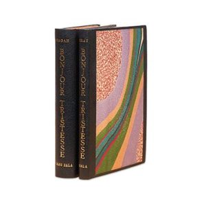 GRAU-SALA. SAGAN (Françoise). Bonjour tristesse. Paris, Lubineau, 1954. Deux volumes in-8, celui du texte maroquin bleu nuit, dos lisse portant le titre frappé en lettres blanches et orangé superposées, les noms d'auteur et illustrateur, les plat et dos offrant un décor mosaïqué en continu, doublure de maroquin orangé bord à bord avec un motif sur plat sup. rappelé en mosaïqué de maroquin blanc, demi-gardes de maroquin blanc bordé de maroquin orangé, couv. illustrée et dos conservés, tranches dorées sur témoins, chemise maroquin noir aux plats ornés d'un papier imprimé ; le vol. de suite en maroquin noir aux plats ornés comme la chemise décrite, un cuivre monté au contreplat inf., l'ensemble dans un étui à 2 compartiments assorti [Galvan]. Edition illustrée de 20 eaux-fortes originales de Grau-Sala dont la couverture et le frontispice. Tiré à 595 exemplaires numérotés sur vélin de Rives : un des 25 de tête (n° 12), contenant un état en noir avec remarques, un état en bistre, une pointe-sèche supplémentaire tirée sur soie, 6 planches refusées, un dessin original, un cuivre encré. Reliure originale signée de l'atelier familial espagnol de Galvan établi à Cadix. PROVENANCE Maurice J. Lachard (ex-libris).