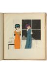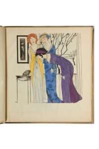[MODE, COSTUME]. IRIBE (Paul). Les robes de Paul Poiret racontées par Paul Iribe. Se trouve à Paris, chez Paul Poiret, couturier, 1908. In-4, cartonnage éditeur, dos muet, titre imprimé en rouge et noir au plat sup., montage sur onglets (sans la jaquette ; dos usé avec traces d'adhésif et lacunes de couvrure mais cart. solide, plat lég. défraîchis). [2] f. (titre, justification), [1] f. blanc, [10] planches gravées et coloriées, [3] f. (1 bl., achevé d'imprimer, 1 bl.). Tiré à 250 exemplaires sur papier Hollande. Une trace d'inscription ancienne sur la 4e de couv. : «Etude de Me Vincent». PROVENANCE Félix Boutreux, peintre (1869-1922), ex-libris gravé sur bois.