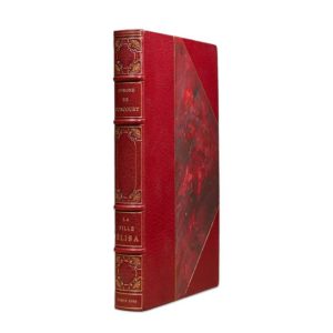 JEANNIOT. GONCOURT (Edmond de). La fille Elisa. Paris, Emile Testard, 1895. In-8, [2] f., VII-257-[1] p. demi-maroquin rouge à coins, dos à 4 nerfs saillants, auteur et titre doré, lieu et date frappées en queue, caissons ornés de 4 f leurons mosaïqués aux angles et bordés de filets dorés et à froid, filet doré sur les plats, tête dorée, couverture et dos illustrés conservés [René Aussourd]. Édition illustrée de compositions de Georges Jeanniot : 60 croquis gravés sur bois dans le texte et 10 eaux-fortes hors-texte dont un frontispice. Un des 38 exemplaires sur papier de Chine (n° 44, 2e papier après 12 japon), contenant : - les 10 hors-texte en 4 états (état terminé, 2 avec remarques, 1 noir), les figures dans le texte en double état (62 pl.), la vignette du titre en 3 états (état définitif, en couleur, et noir). - le prospectus (4 f. et une planche). - le feuillet accompagnant la livraison du 1er état d'une planche supprimée ; il semble que ladite planche soit placée ici en regard de la page 194.