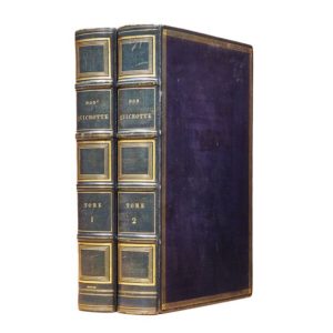 JOHANNOT. CERVANTES SAAVEDRA (Miguel de). L'ingénieux hidalgo Don Quichotte de la Manche. Texte traduit de l'espagnol et annoté par Louis Viardot. Paris, J.-J. Dubochet, 1836. 2 vol. grand in-8, veau glacé noir, dos à 4 nerfs, titre et tomaison dorés, caissons et plats bordés de filets dorés multiples, filet doré sur les coupes, roulette dorée sur les coiffes et chasses, tranches dorées [Koehler] (petits frott. sur les coins et mors sup. du t.2, qq. pages uniformément brunies, rares rousseurs). Édition illustrée de compositions de Tony Johannot gravées sur bois : un portrait de Don Quichotte en frontispice du tome 1 gra­vé par Porret, un autre portrait au tome 2 gravé par Breviere, un titre-frontispice au début de chaque tome et de nombreuses vignettes dans le texte. (Carteret III, 136-137).