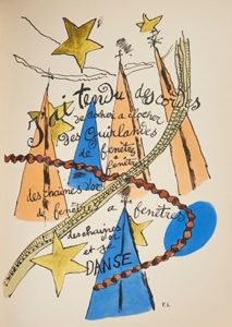 LANSKOY. LECUIRE (Pierre). Cortège. Paris, Pierre Lecuire, 1959. In-folio (45,5 x 34 cm), en feuilles sous couverture illustrée rempliée et chemise cartonnée illustrée (chemise frottée ; sans l'étui). Édition originale. Ouvrage illustré de 24 compositions en couleurs à pleine page au pochoir dont une à double-page et la couverture. La chemise est également illustrée d'un pochoir d'après l'artiste. Les planches ont été exécutées au pochoir par Maurice Beaufumé sous la direction et d'après les papiers collés du peintre russe André Lanskoy (1903-1976). Tirage limité à 170 exemplaires sur papier vélin d'Arches, signés par l'auteur et l'artiste : un des 20 hors-commerce (n° I).