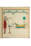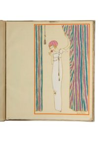 [MODE, COSTUME]. LEPAPE (Georges). Les choses de Paul Poiret vues par Georges Lepape. Paris, Paul Poiret [Impr. Maquet], 1911. In-4, cartonnage blanc éditeur, titre en rouge et illustration en noir au plat sup., montage sur onglets (tache claire en pied de la couv. sup.). [4] f. (1 blanc, titre, justification, 1 bl.), 12 planches imprimée en cou­leurs et rehaussées, de formats variables et sur des papiers divers. Tirage limité à 1300 exemplaires.