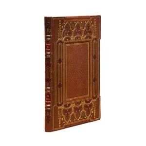 MALASSIS. BALZAC (Honoré de). La belle Imperia. Conte drolatique. Paris, Louis Conard, 1903. In-8, maroquin havane, dos à 4 doubles-nerfs saillants, pièces de titre et du nom d'auteur, caissons ornés de filets dorés et f leurons mosaïqués, décor architectural aux plats, composé aux filets dorés avec pièce rouges mosaïquées, une réserve rectangulaire en creux au centre, et 3 biseaux sur les côtés des plats, contreplats bordés de maroquin décoré d'un filet doré, doublures et gardes de satin moiré coloré, tranches dorées sur témoins, couv. parcheminées conservées, étui [J. Kauffmann] (fente et frott. à l'étui). Édition illustrée de 30 compositions du peintre Edmond Malassis (1874-1940), gravées sur bois ou en héliogravure, certaines co­loriées et rehaussées à l'or. Tirage limité à 170 exemplaires : un des 150 sur papier vélin (n° 82). Curieuse reliure originale néo-gothique signée de Kaufmann. PROVENANCE Paul-Eugène Lefebvre de Viefville (1837-1917), président de Chambre à la Cour d'Appel de Paris (ex-libris) ; Maurice J. Lachard (ex-libris).