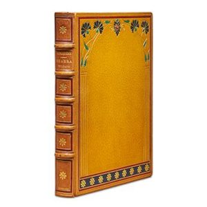 RASSENFOSSE. FARRÈRE (Claude). Shahra sultane, ou les sanglantes amours authentiques et mirifiques de Sultan Shah'Riar, roi de la Perse et de la Chine, et de Shahrâ sultane, héroine. Paris, Dorbon 1923. Petit in-4, maroquin citron, dos à 5 nerfs saillants, auteur, titre, lieu et date dorés, caissons ornés d'un f leuron doré et bordés d'un listel mosaïqué, plats décorés d'une composition formant cadre architectural, avec filets dorés, listel en bordure et pièces f lorales mosaïquées, pointillé doré aux coupes, contreplats bordés de maroquin orné d'une roulette, de 3 filets et de f leurons angulaires, le tout doré, doublure et garde de satin moiré ocre, deuxième garde de papier marbré, tête dorée, couv. et dos conservés, non rogné [Flammarion Vaillant] (dos bruni, petit accroc une coiffe). Édition illustrée de compositions d'Armand Rassenfosse : un fron­tispice, des illustrations en couleurs dans le texte, des ornements. Tiré à 550 exemplaires : un des 50 de tête (n° 35) contenant une triple suite des illustrations, dont 2 avant la lettre et de couleurs différentes, et un croquis original de Rassenfosse, au crayon rehaussé d'aquarelle. PROVENANCE Maurice J. Lachard (par descendance).