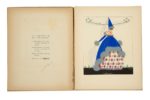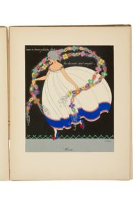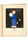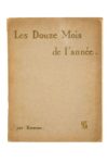 [MODE, COSTUME]. ROMME (Martha). Les douze mois de l'année. Album de douze aquarelles. Paris, Sauvage [v. 1919]. In-4, [2] f., 12 pl., en feuilles sous chemise éditeur (dos de la chemise fendu, les 2 f. de texte séparés avec manque en marge du dernier). Bel album composé de 12 compositions imprimées et coloriées au pochoir, certaines rehaussées à l'argent. Chaque planche, titrée du nom d'un mois révolutionnaire, offre un modèle féminin en pied revêtu d'une robe extravagante, évoquant d'une façon un peu caricaturale la haute couture de l'époque Art Déco. Tirage limité à 270 exemplaires signés par l'artiste à la justification : un des 250 sur papier de luxe (n° 78, seul papier après 20 japon).
