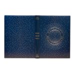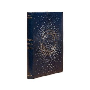 SCHMIED. MORAND (Paul). Paysages méditerranéens. Paris, [F.-L. Schmied], 1933. In-4, maroquin bleu, dos lisse, titre, noms d'auteur et d'illustrateur dorés, les deux plats semés d'étoiles dorées, avec au plat supérieur le titre inscrit à l'or dans des cercles concentriques, doublures et gardes de papier bleu semé d'étoile noir et argent, tête dorée, couv. et dos conservés, chemise demi-maroquin doublée de veau fauve, étui [Paul Bonet] (dos de la chemise passé, infimes frott. à l'étui). Édition originale illustrée de 71 compositions de François-Louis Schmied, dont 58 en couleurs, vignettes, bandeaux et bouts-de-lignes, gravées sur bois par F.-L. Schmied lui-même, avec la collaboration de son fils Théo Schmied et de G. Rougeaud. Tirage limité à 110 exemplaires sur papier vélin d'Arches (n° 20). Elégante et sobre reliure originale signée de Paul Bonet, au décor céleste et lumineux, datée de 1939. PROVENANCE Maurice J. Lachard (ex-libris).
